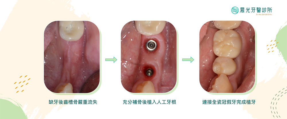 2. 植牙穩定的地基來⾃於健康的⿒槽骨,如果⿒槽骨骨量不⾜,需先進⾏補骨的動作,⿒槽骨的重建與植牙假牙是否能長期穩定使⽤有很⼤的關係,需仔細進⾏。