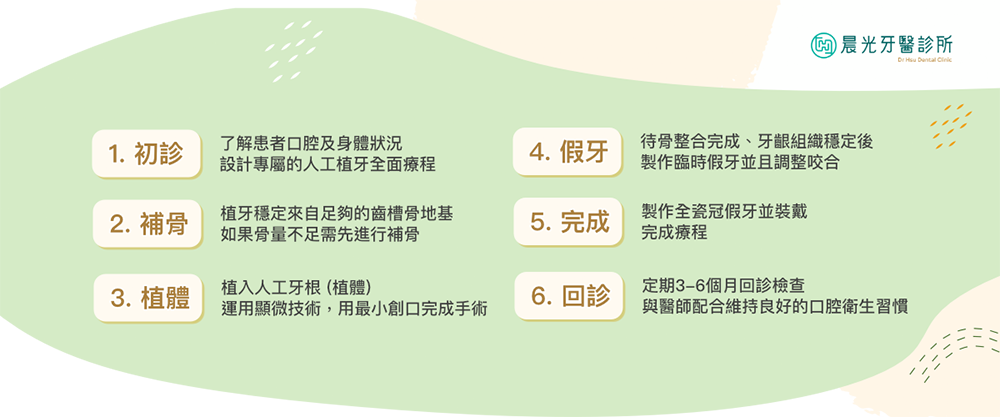 6. 定期 3~6 個⽉回診檢查清潔,並與醫師配合,維持良好的⼝腔衛⽣習慣,讓⼈⼯植牙假牙與植體能長期使⽤。