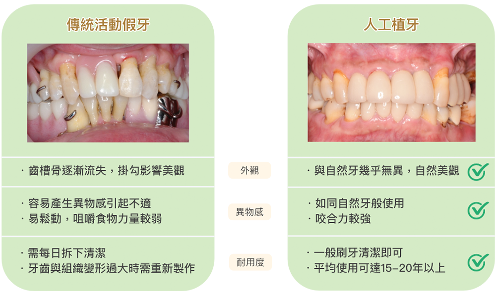 如果是已使⽤傳統假牙,但不習慣固定牙橋假牙清潔不易,且常發⽣牙周病、牙齦萎縮,與蛀牙的問題者,或是不習慣活動假牙咀嚼無⼒,影響⽣活品質者,也可以與專業牙醫師討論改⽤⼈⼯植牙的可能性。