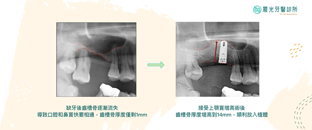 如果沒有先進⾏補骨的話,植牙時可能會有⿐竇穿孔的風險,或者遷就骨量的不⾜使⽤不穩定的短植體,影響植牙壽命。