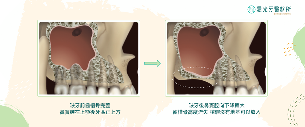該區缺牙後,⿒槽骨會逐漸被吸收掉、⿐竇粘膜向下擴張,會使得植牙時⿒槽骨深度不夠乘載植體,這時就需要上顎竇增⾼術來補⾜適量的⿒槽骨。