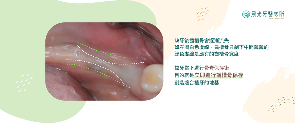 拔牙時盡量不傷害到周圍的⿒槽骨與軟組織,並將不好的⾁芽發炎組織刮除乾淨,並透過骨粉、膠原蛋⽩製劑或再⽣膜,保留拔牙區骨嵴的⾼度及寬度,為後續的植牙療程建置出友善環境。